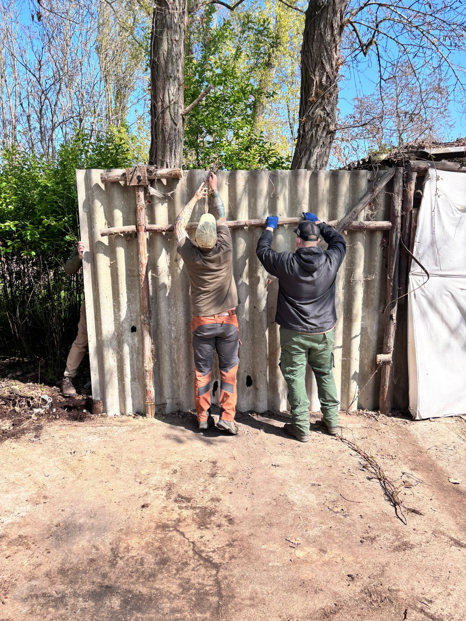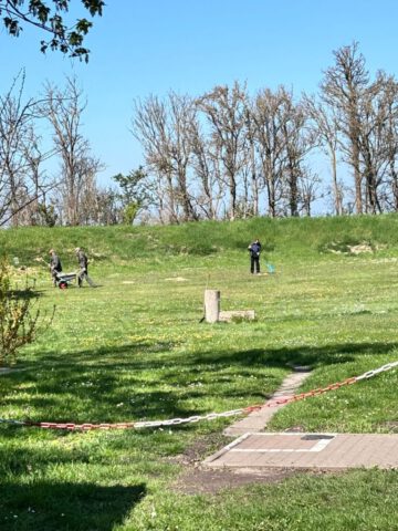 Auf dem Taubenstand wurden Schrotbecher sowie Reste von Wurfscheiben zusammengeharkt und in unzähligen Schubkarrenladungen in einen bereitgestellten Container verbracht. Parallel dazu erfolgte auf der 100-Meter-Bahn die Aufarbeitung der Zielscheibenaufnahmen, indem alte, mehrfach übereinander getackerte Scheiben entfernt und die Aufnahmen neu hergerichtet wurden.