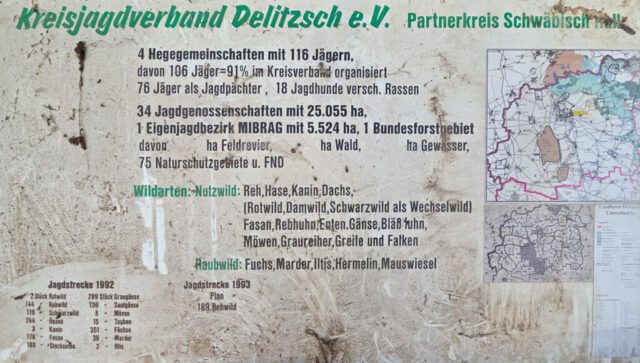 Beim Abriss des Schuppens wurde zudem eine historische Tafel aus dem Jahr 1992 entdeckt. Diese zeigt die Jagdreviere des damaligen Kreises Delitzsch, einschließlich des geplanten Verlaufs der Tagebaue, sowie Jagdstrecken und weitere Informationen des damaligen Kreisjagdverbandes Delitzsch. Eine Abbildung dieser Tafel ist dem Beitrag beigefügt.