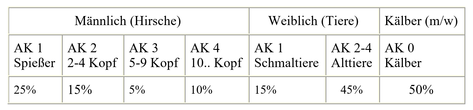Der Abschussplan wird prozentual nach den oben gelisteten Prozenten nach Altersklasse erstellt, wobei sich der Anteil der Kälber mit je 50% männlich und weiblich dazu ergänzt. Die Bewirtschaftung erfolgt in 3-Jahresplänen, wobei der Überhang des jeweilig vorangegangenen Jahres den aktuellen Jahresplan erhöhen oder senken kann.